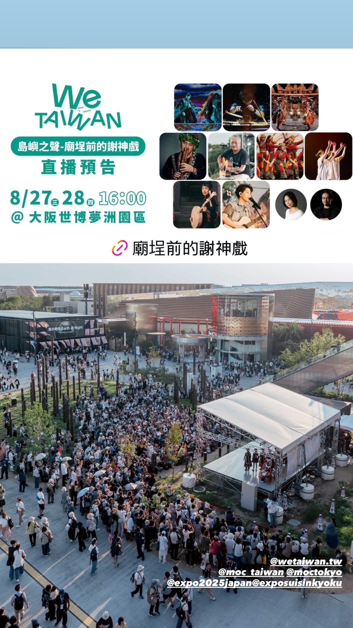 臺灣的朋友們,16:00請關注「文化部粉專」我們在大阪萬博的《廟埕前的謝神戲》即將直播開演囉!