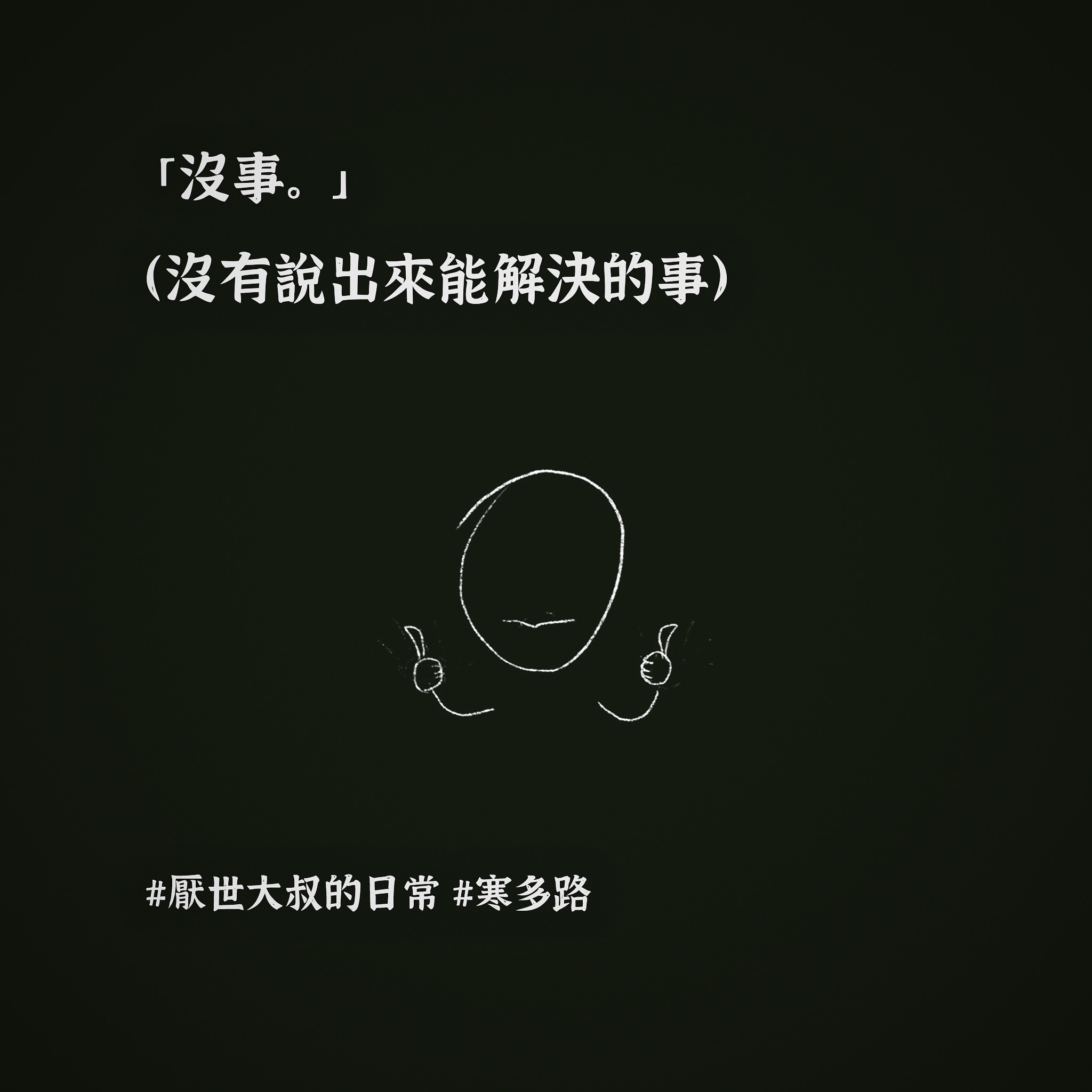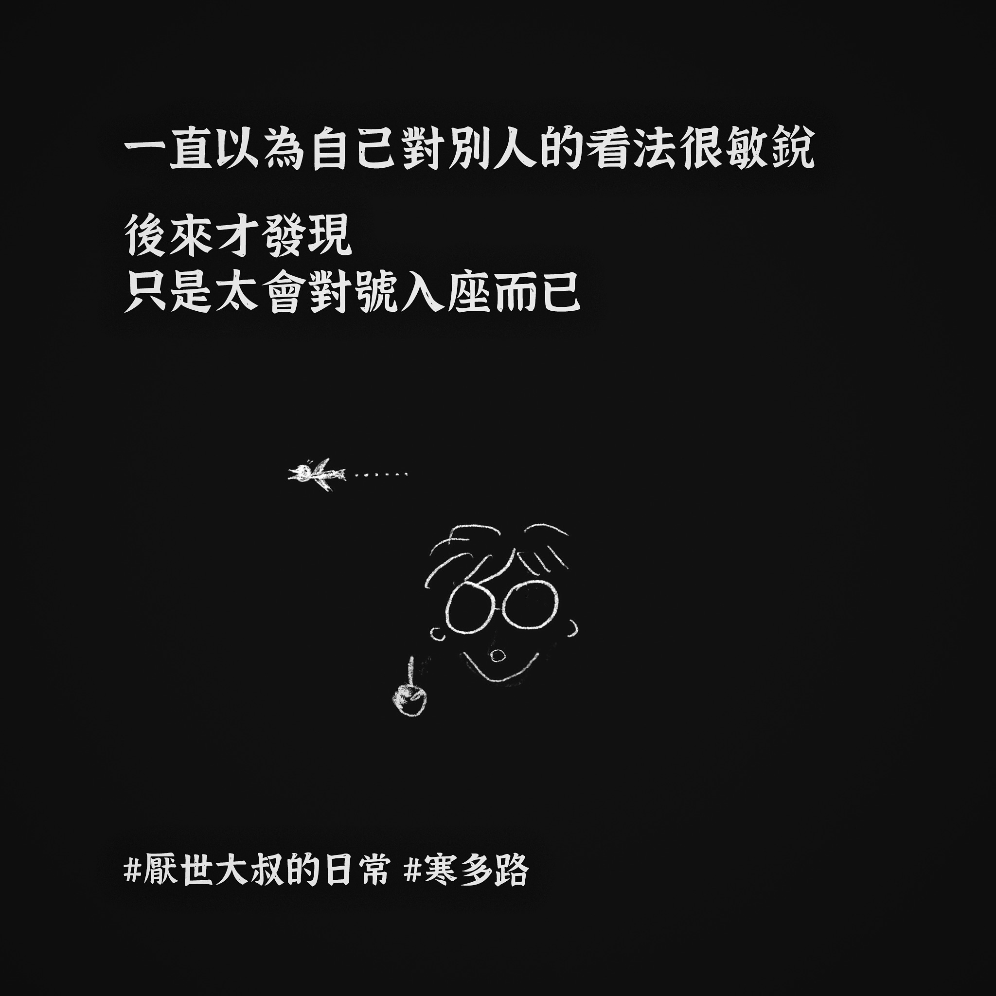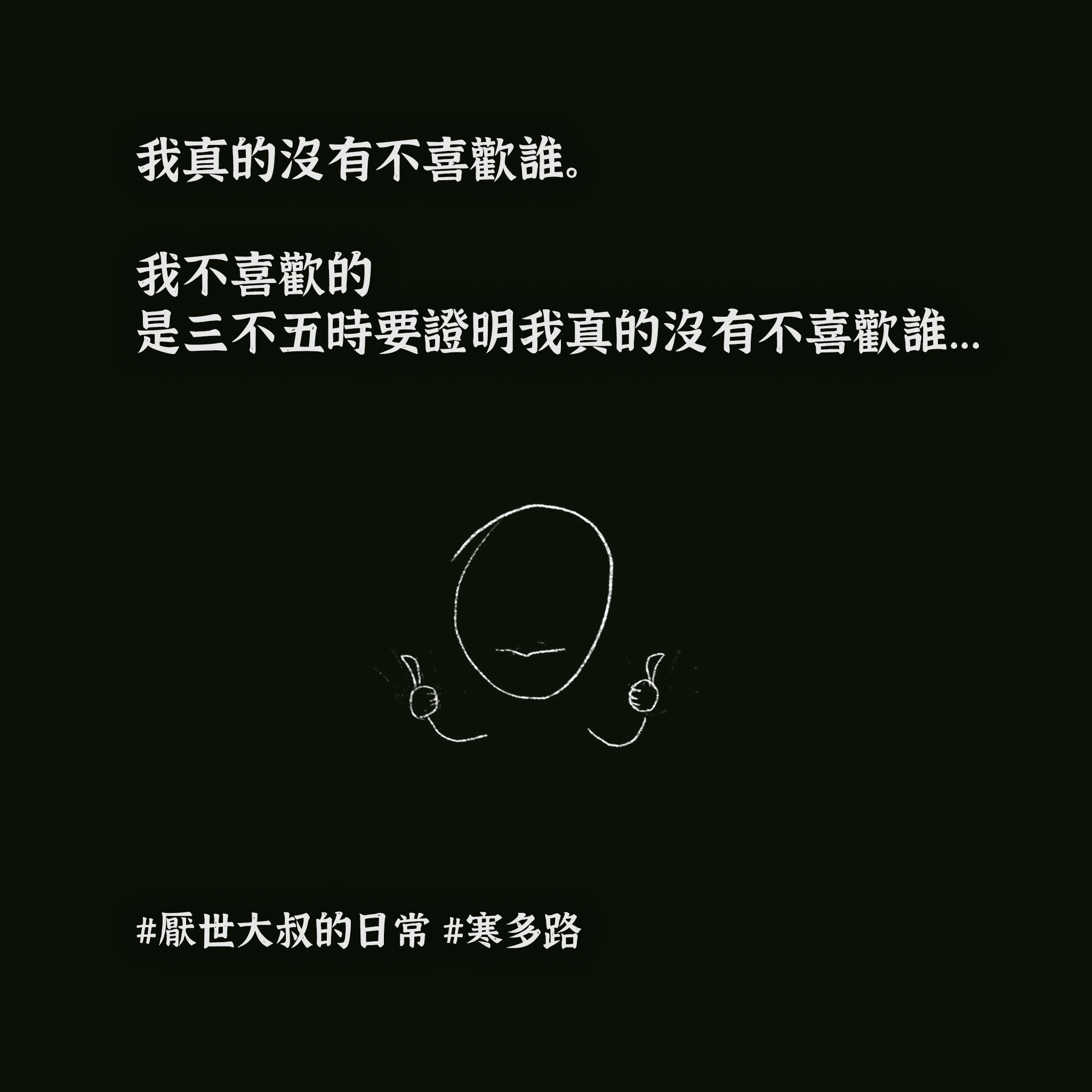 有的人以為你不喜歡他,所以他決定先不喜歡你。但你並沒有不喜歡他,就不知為何被他不喜歡了。所以得三不五時讓他知道你沒有不喜歡他。這件事真的好累。#厭世大叔的日常 #寒多路