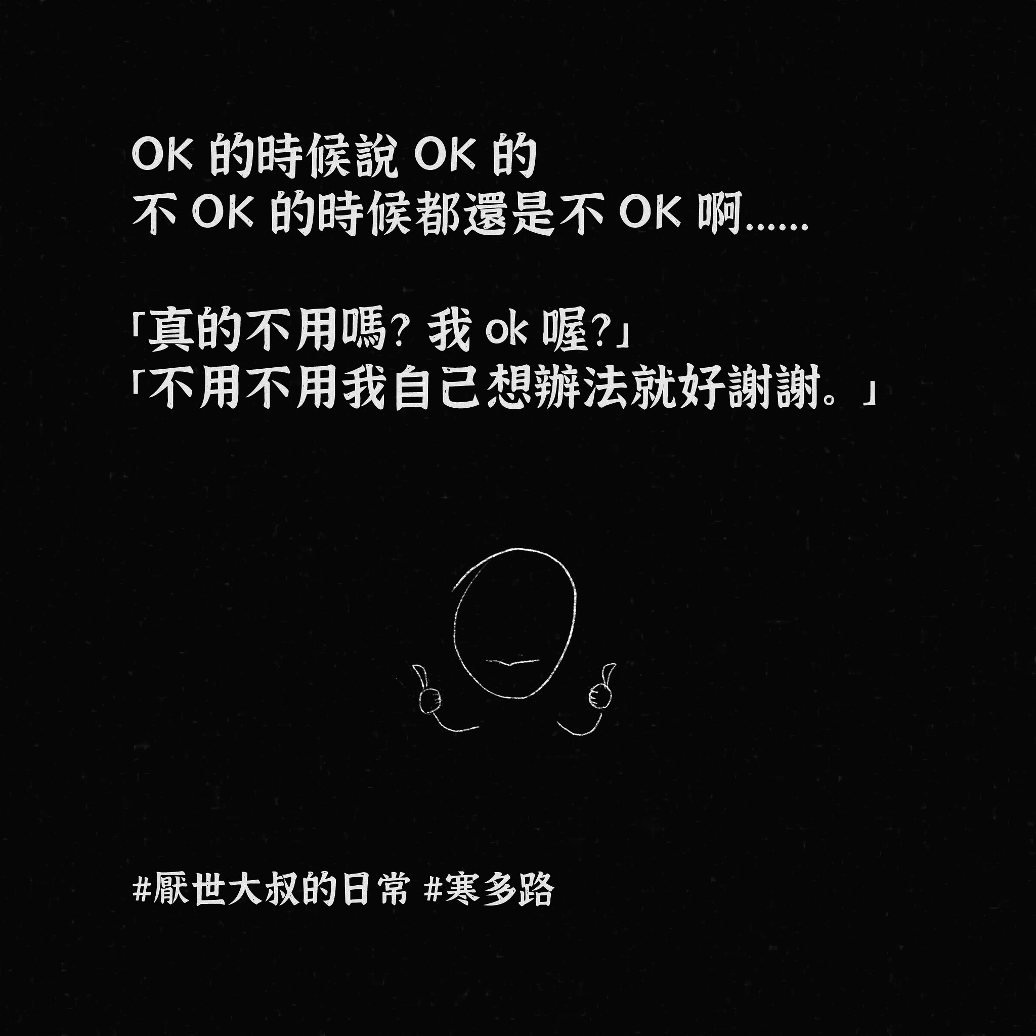 其實沒把握能不在意就說不 ok 我也不會怎麼樣喔反而昨天說 ok 今天不爽又不 ok我會很困擾啊#厭世大叔的日常 #寒多路