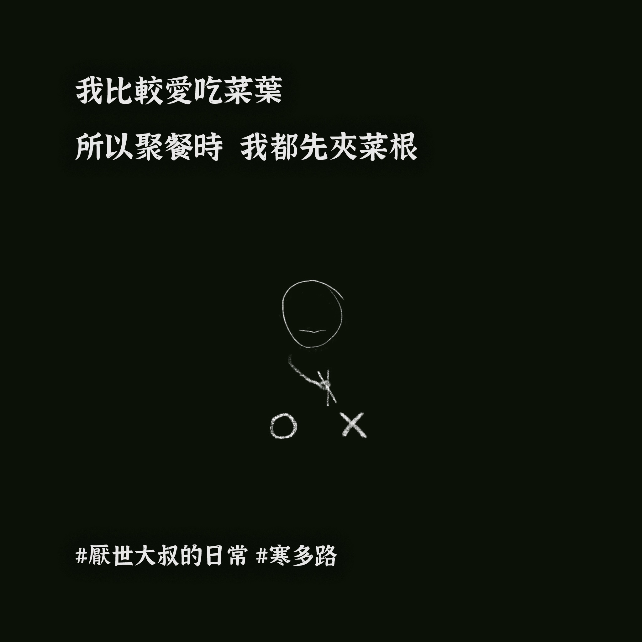 因為怕人家覺得,我都挑我喜歡的吃,所以反而刻意避開自己愛吃的、先夾自己不愛吃的。但仔細想想誰知道我愛吃什麼呢「這個人是不是很愛吃菜根,就一直夾菜根吃啊?好自私喔。」說不定會這樣想呢。#厭世大叔的日常 #寒多路