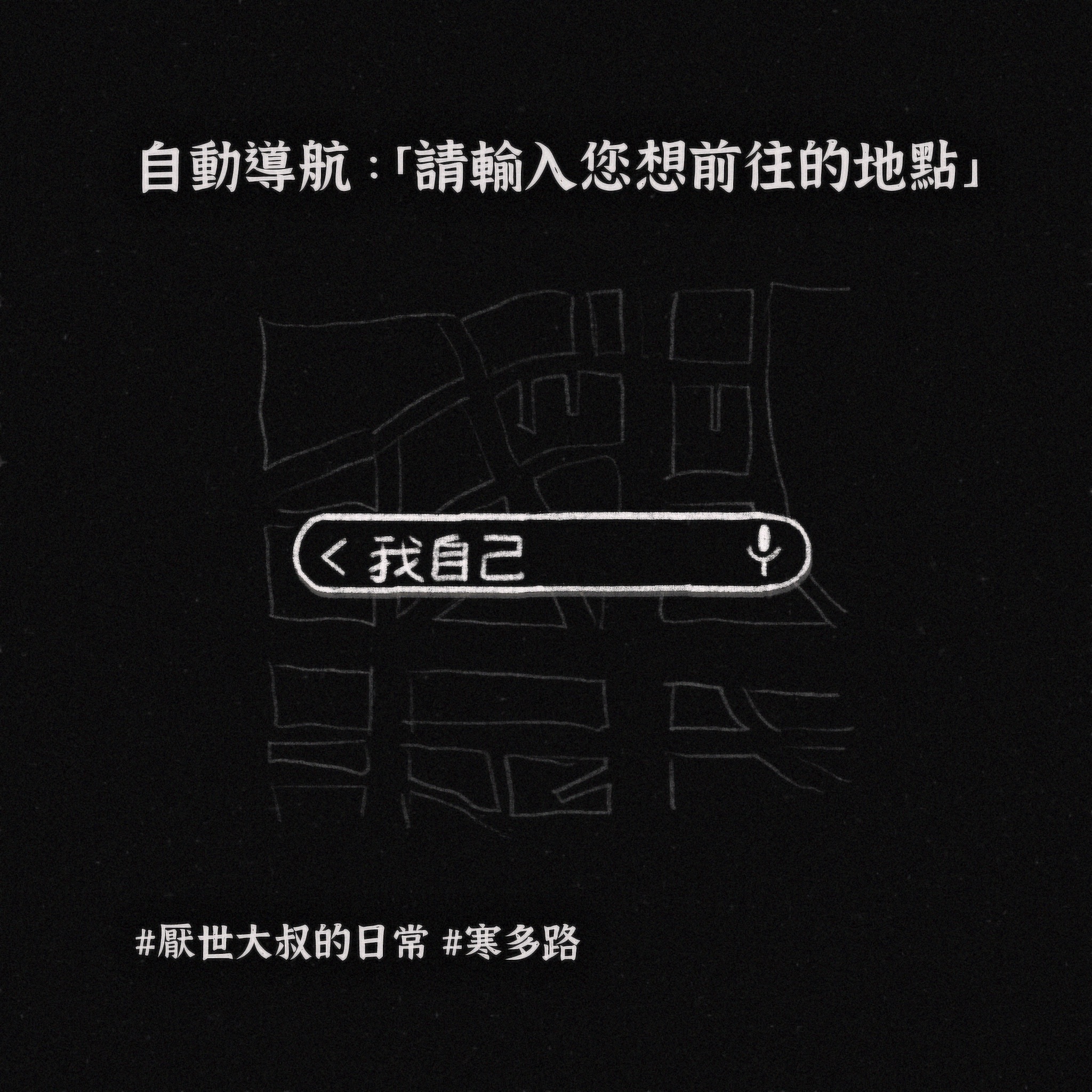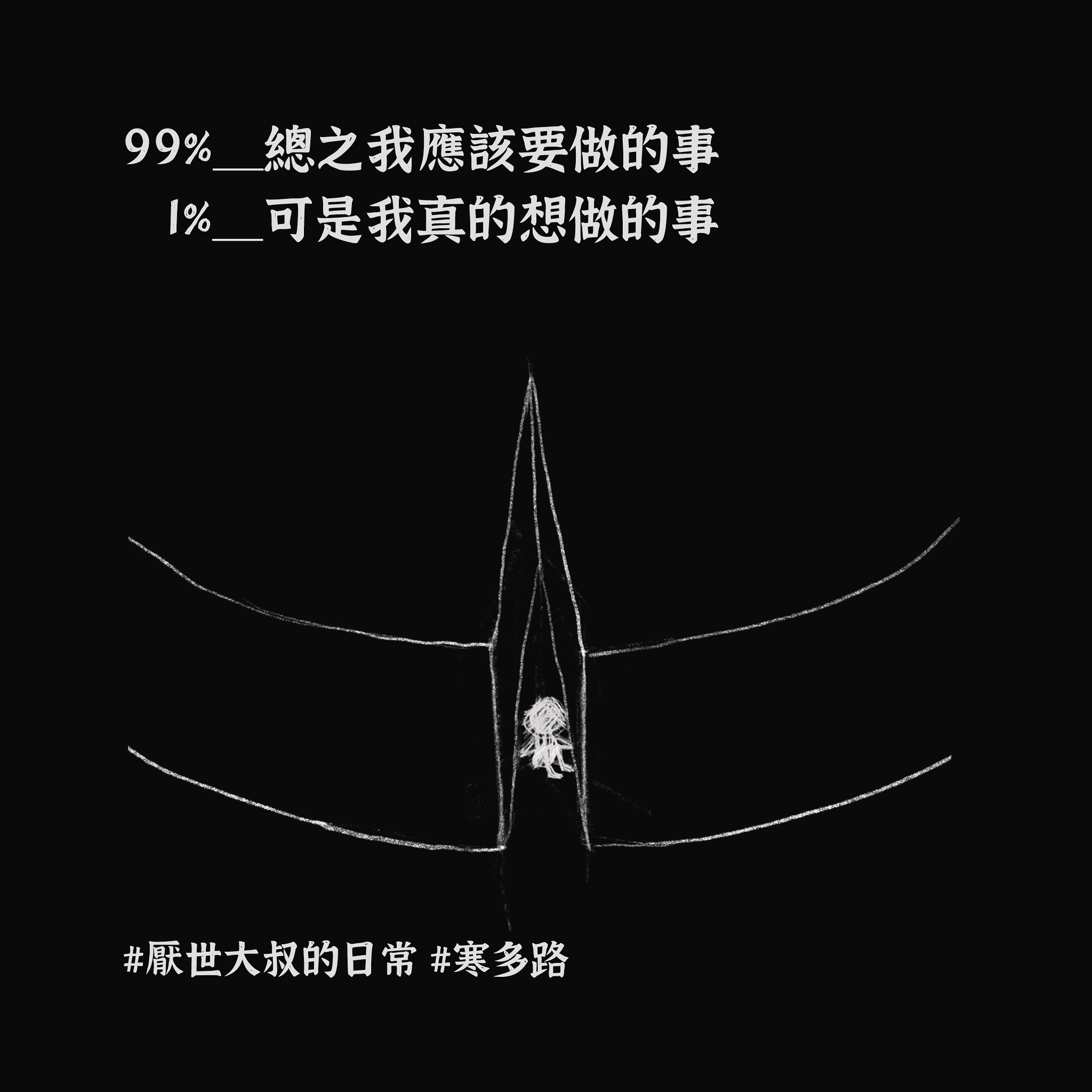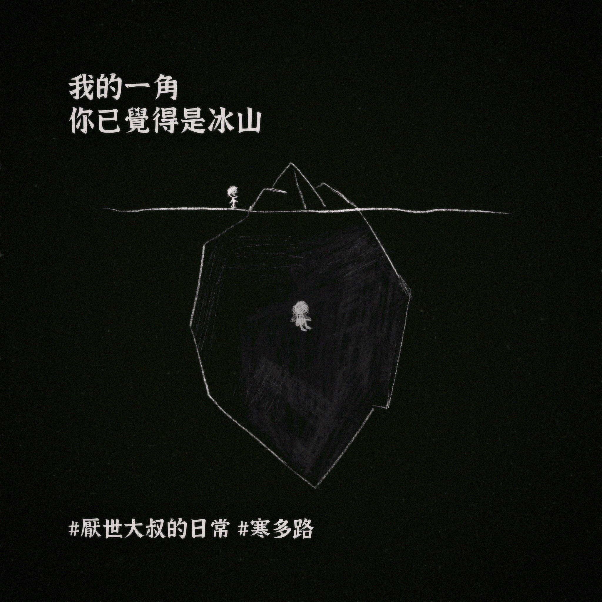 我的心裡永遠有個深不見底的黑洞,吞噬所有的美好: 它在我曬太陽時跟著我 在我看煙火時跟著我 在我跟朋友乾杯時跟著我。 不知何時開始,我有了這樣的覺悟: 只要是我想得到的,我必得不到。 只要是我想做到的,我必做不到 而且 搞砸一切的 總是我自己。 有時真的覺得 對不起 我是這樣的我。 唯一能做的 就是把這個黑洞 寫成一首歌。 厭世大叔寒多路,最誠實的一首心聲。