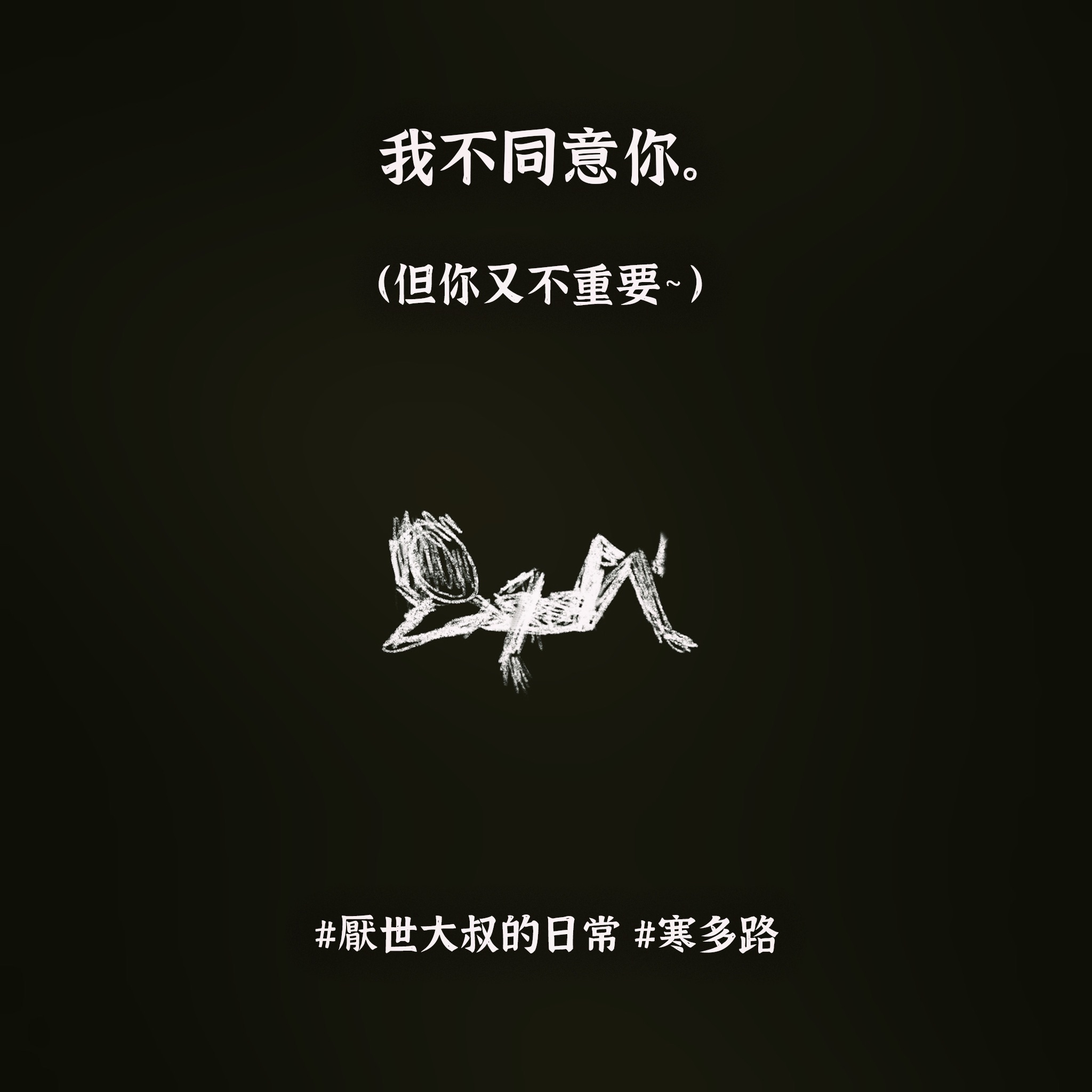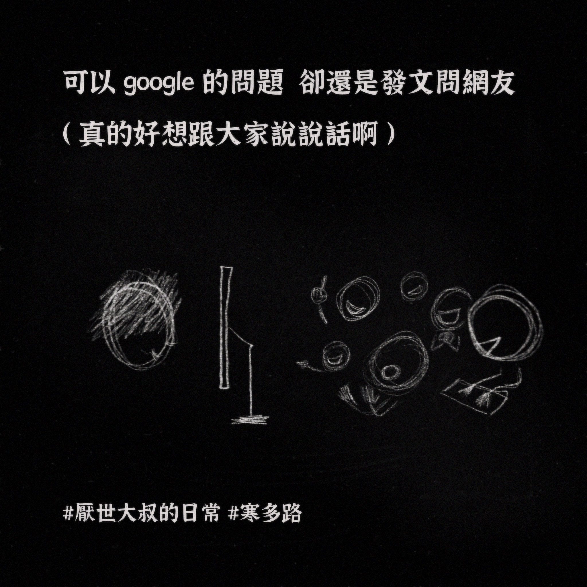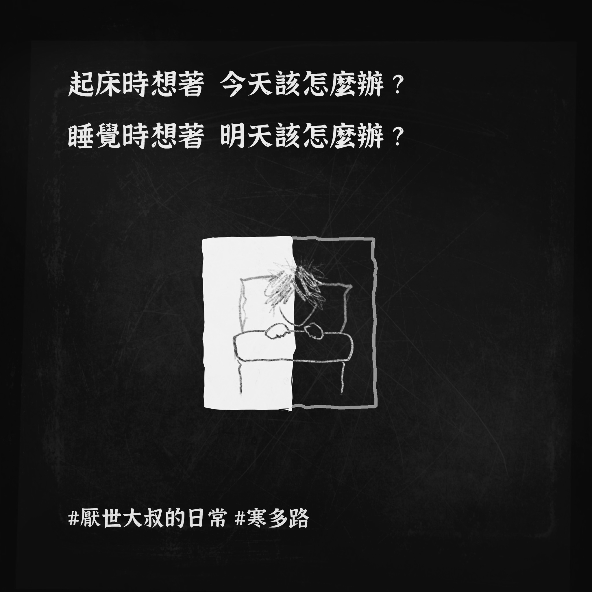 我的心裡永遠有個深不見底的黑洞,吞噬所有的美好: 它在我曬太陽時跟著我 在我看煙火時跟著我 在我跟朋友乾杯時跟著我。 不知何時開始,我有了這樣的覺悟: 只要是我想得到的,我必得不到。 只要是我想做到的,我必做不到 而且 搞砸一切的 總是我自己。 有時真的覺得 對不起 我是這樣的我。 唯一能做的 就是把這個黑洞 寫成一首歌。 厭世大叔寒多路,最誠實的一首心聲。