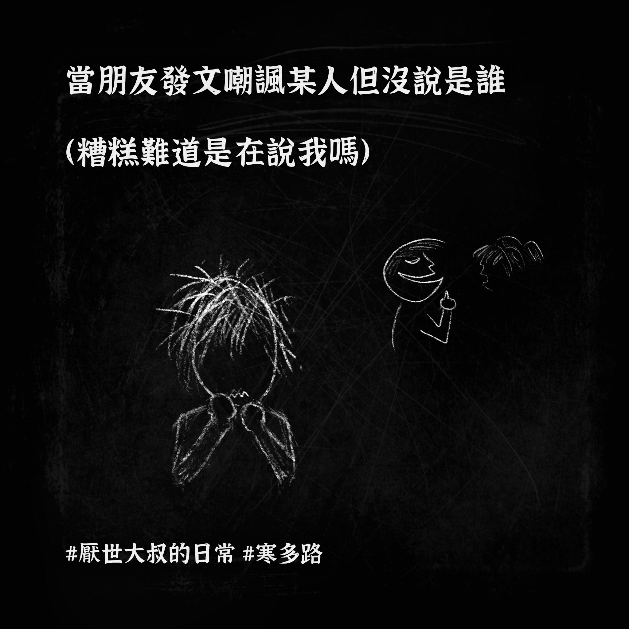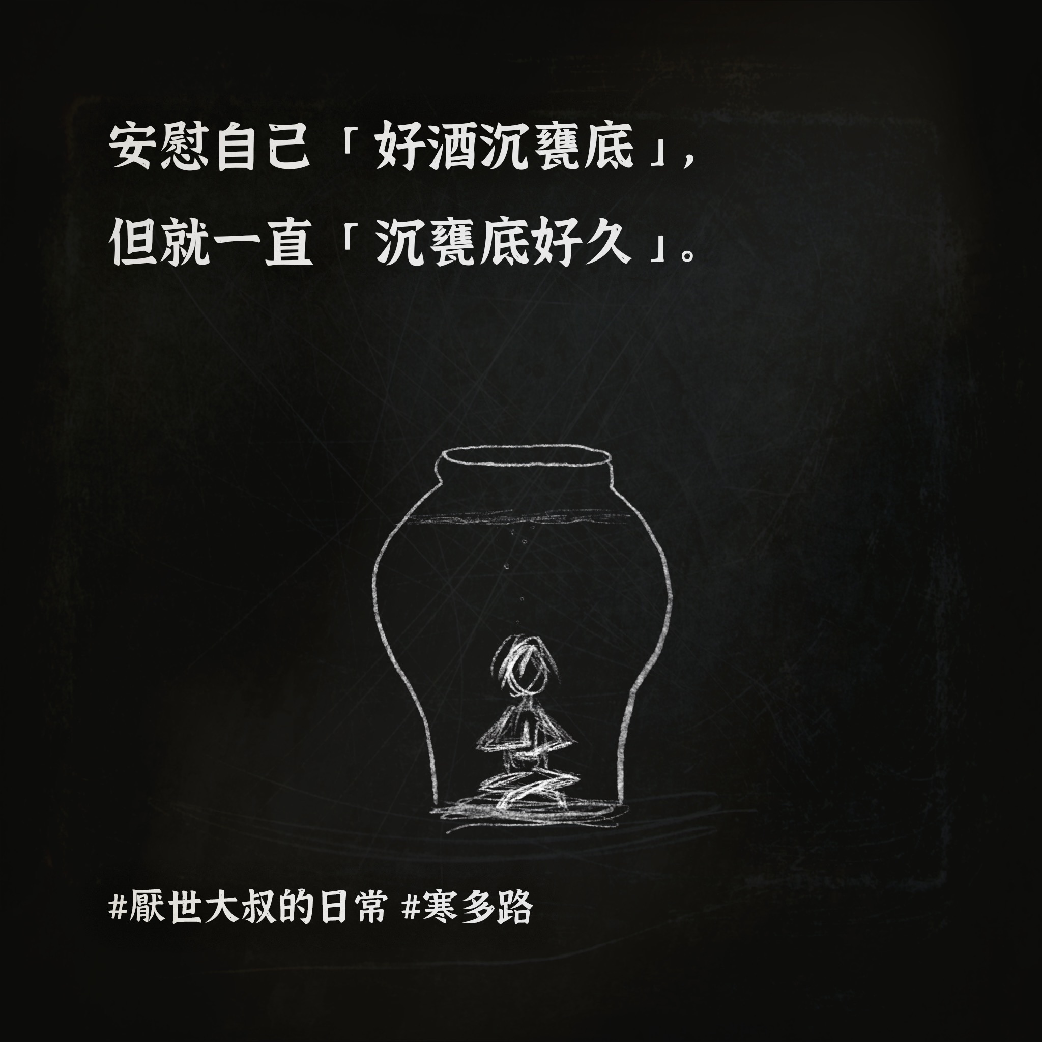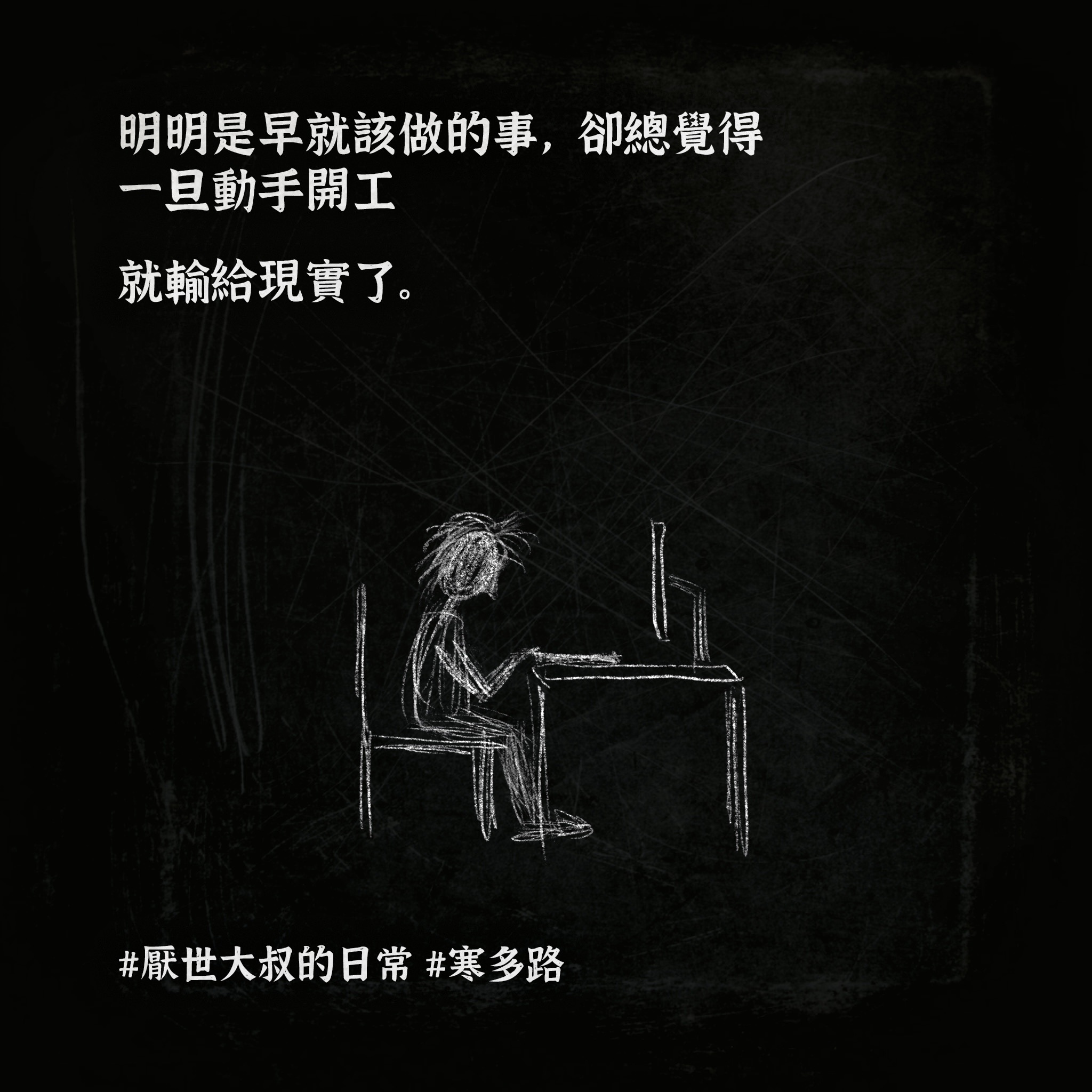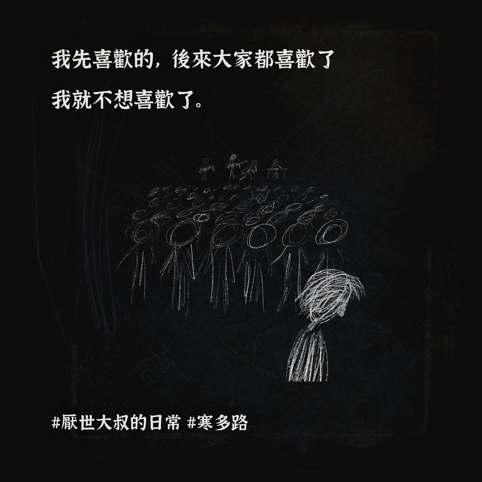 我的心裡永遠有個深不見底的黑洞,吞噬所有的美好: 它在我曬太陽時跟著我 在我看煙火時跟著我 在我跟朋友乾杯時跟著我。 不知何時開始,我有了這樣的覺悟: 只要是我想得到的,我必得不到。 只要是我想做到的,我必做不到 而且 搞砸一切的 總是我自己。 有時真的覺得 對不起 我是這樣的我。 唯一能做的 就是把這個黑洞 寫成一首歌。 厭世大叔寒多路,最誠實的一首心聲。