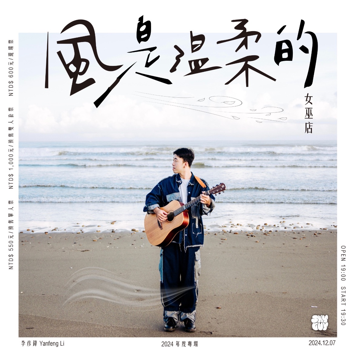 《風是溫柔的—2024女巫店年度專場》 我想看見你沒有憂愁,自在的和風跳舞,被風擁抱,溫柔和煦。 寫歌即將邁入十個年頭,《後生人》小巡迴結束後, 我時常思考不停下寫歌的原因是什麼, 發現是我不想忘記每個給予過溫柔眼神的你, 是你們讓這些歌有處安放, 女巫店是個新起點,與我一起往下個階段邁進吧。 日期:2024.12.07(六) 時間:open :19:00 / start:19:30,現場依排隊順序入場 地點:女巫店(台北市大安區新生南路三段56巷7號1樓) 票價:預售單人550/ 預售雙人1000/現場600(皆含飲×1) 開賣時間:2024.10.13(日)12:00 主辦單位:女巫店 購票連結:https://ticketplus.com.tw/activity/c2ceab7085d1359b8ea43f79e275fd14?fbclid=PAZXh0bgNhZW0CMTEAAaYeCS-Y2iYe1IibUPpsFNiSrBoTiFpCI3CDJVqK0DpKR_vuW6NQN1ajFM0_aem_uJeCLlHCC-qh9cRlTlDQCw
