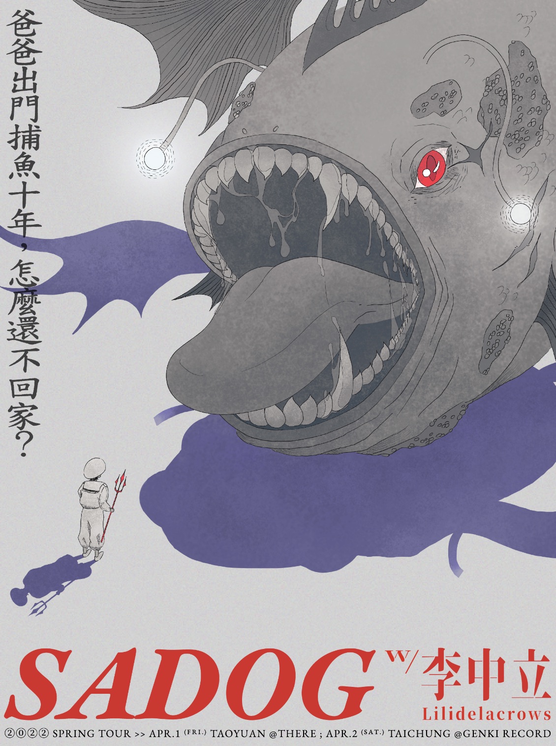 ?「爸爸出門捕魚十年,怎麼還不回家?」2022 SADOG 春季巡迴正式開賣 ? —— 場次資訊 —— 4/01(五) ? 桃園 T h E R E 音樂展演空間 ⏰ 19:30 觀眾入場 / 20:00 開始演出 ? https://www.indievox.com/activity/detail/22_iV01415f1 4/02(六) ? 台中 元氣唱片行 ⏰ 19:30 觀眾整隊 / 20:00 開始演出 ? https://forms.gle/jt82dpoQ1MeVd3n58