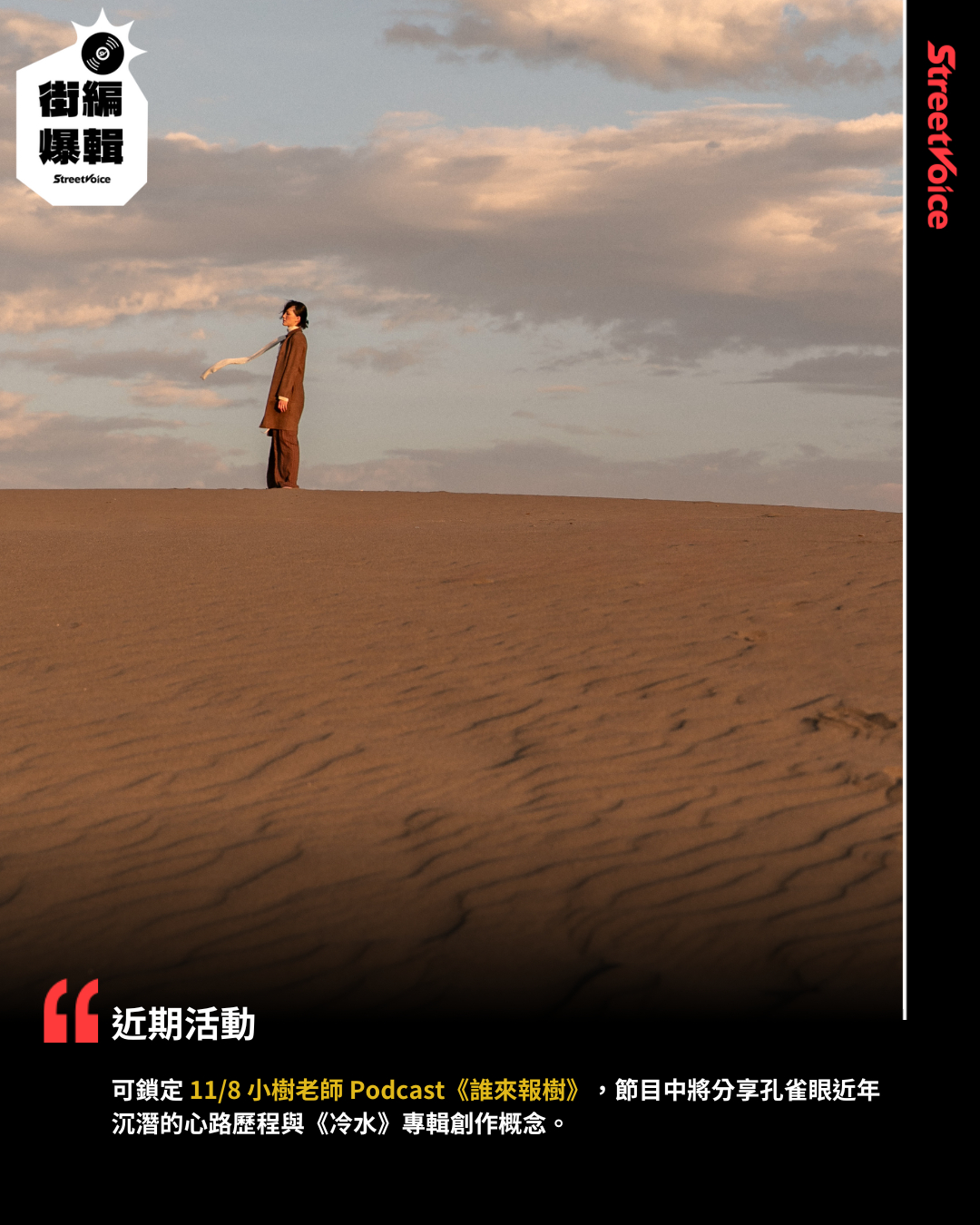 可鎖定 11/8 小樹老師 Podcast《誰來報樹》,節目中將分享孔雀眼近年沉潛的心路歷程與《冷水》專輯創作概念。