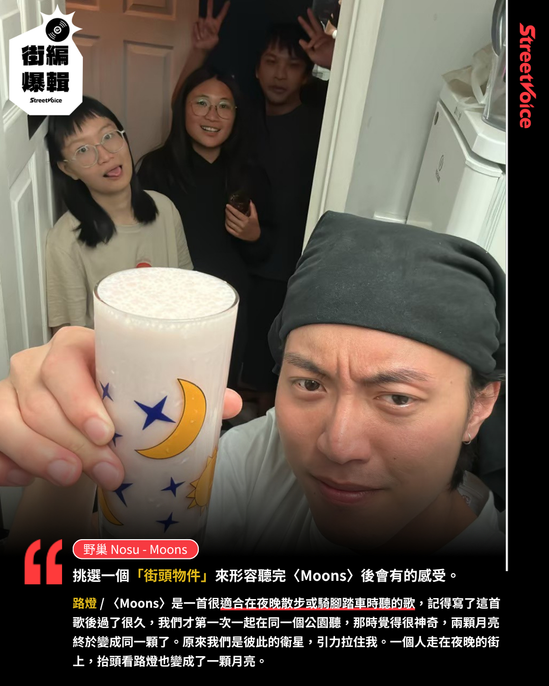 A:路燈 / 〈Moons〉是一首很適合在夜晚散步或騎腳踏車時聽的歌,記得寫了這首歌後過了很久,我們才第一次一起在同一個公園聽,那時覺得很神奇,兩顆月亮終於變成同一顆了。原來我們是彼此的衛星,引力拉住我。一個人走在夜晚的街上,抬頭看路燈也變成了一顆月亮。