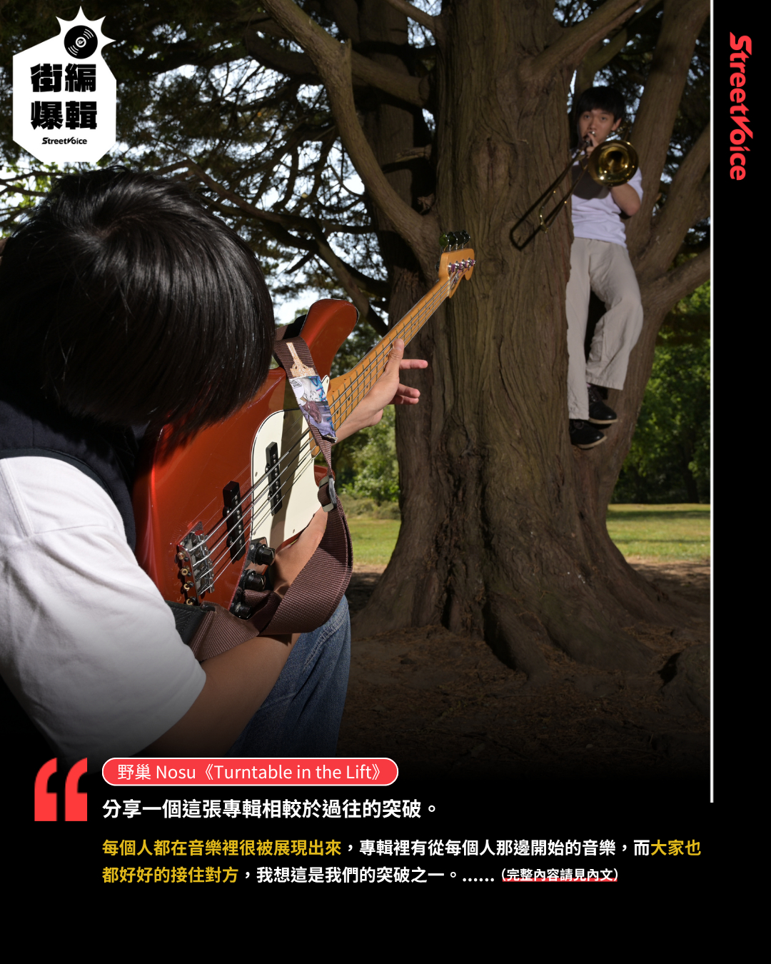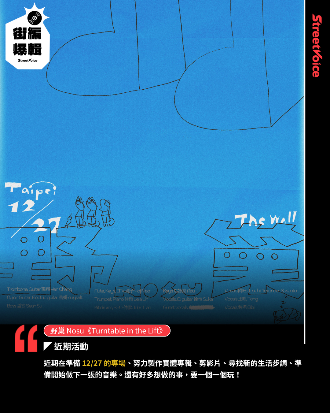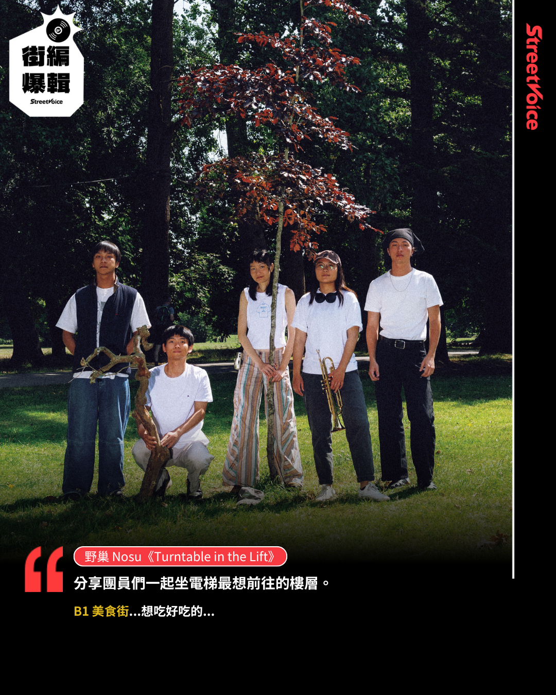 我們的第一張專輯《Turntable in the Lift》,標題有兩個意思,一個是電梯裡會放的背景音樂,一個是電梯裡的唱盤。這張專輯的音樂橫跨了兩年的時間,記錄了野巢從上一張EP到今天的蛻變,我們分散各地、遇到不同的夥伴,寫下新的文字、新的音樂。時間、空間的變化轉化成「電梯」,音樂就這樣在電梯裡的唱機上一直轉,下一層會到哪裡?門打開又是全新的風景。
