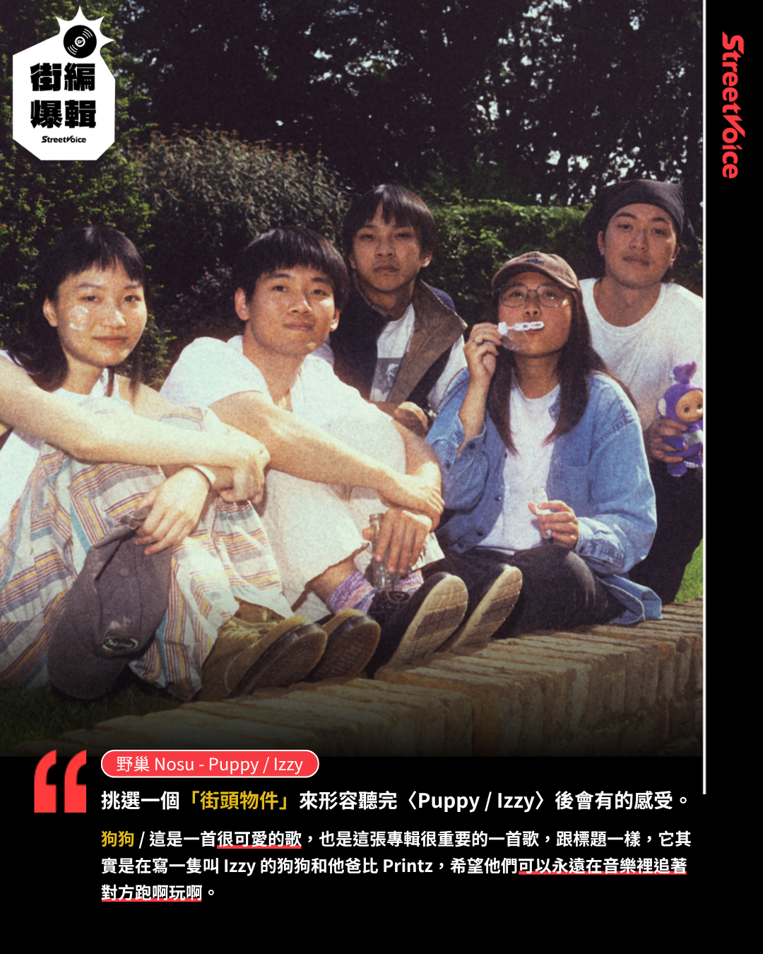 A:狗狗 / 這是一首很可愛的歌,也是這張專輯很重要的一首歌,跟標題一樣,它其實是在寫一隻叫 Izzy 的狗狗和他爸比 Printz,希望他們可以永遠在音樂裡追著對方跑啊玩啊。