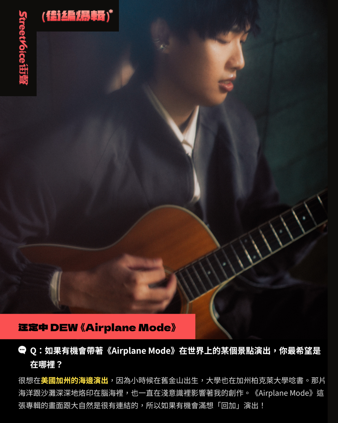 很想在美國加州的海邊演出,因為小時候在舊金山出生,大學也在加州柏克萊大學唸書。那片海洋跟沙灘深深地烙印在腦海裡,也一直在淺意識裡影響著我的創作。《Airplane Mode》這張專輯的畫面跟大自然是很有連結的,所以如果有機會滿想「回加」演出!
