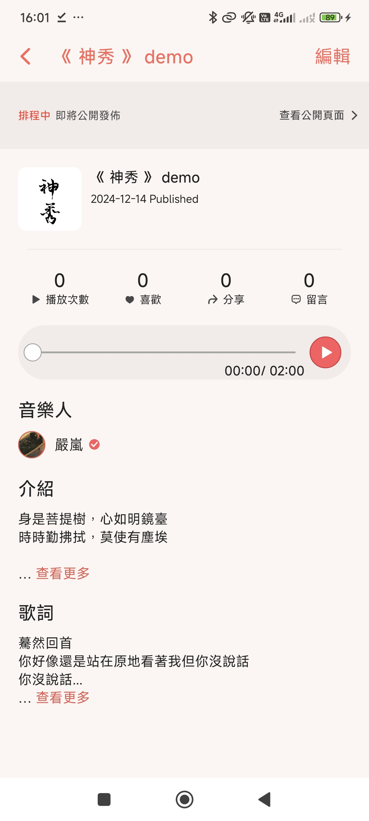 總之手法大概就是讓每組bar都能承上啟下有連貫性的同時 也盡量都提到一些合乎邏輯、可共存、卻相互衝突的元素 然後讓描繪出的核心概念都貼著設定好的「反骨、非主流」去走 至於我的淫穢 是我覺得「做第一也做不到的第二」很酷 是「數據流量不高卻義無反顧,才更凸顯了我對此的熱愛」的自命清高 所以哪怕這樣做的成果不好,我也仍然義無反顧的持續 這樣不虛偽嗎?不!虛偽透了! 但我怎麼可能說得出口? 怎麼可能一直否定自己到不給自己留下任何的活路? 我是做不到的,從來都做不到根本的不去計較 就像神秀為了接過弘忍的衣缽, 所以當初寫下了「身是菩提樹」的偈 這首偈並沒有不好,但他根本上就是不夠優秀、就不是最正確的觀念 根本上的錯誤,是最深沉的痛 我對此無力回天, 也就此接受自己的庸俗、自己的平凡 就如同那天在白牆的文寫下的 “ 我知道自己還是個俗人 所以頂多只能是神秀而不是慧能 ” 所以這首歌才叫做「神秀」,而不是什麼飛蟲的篝火