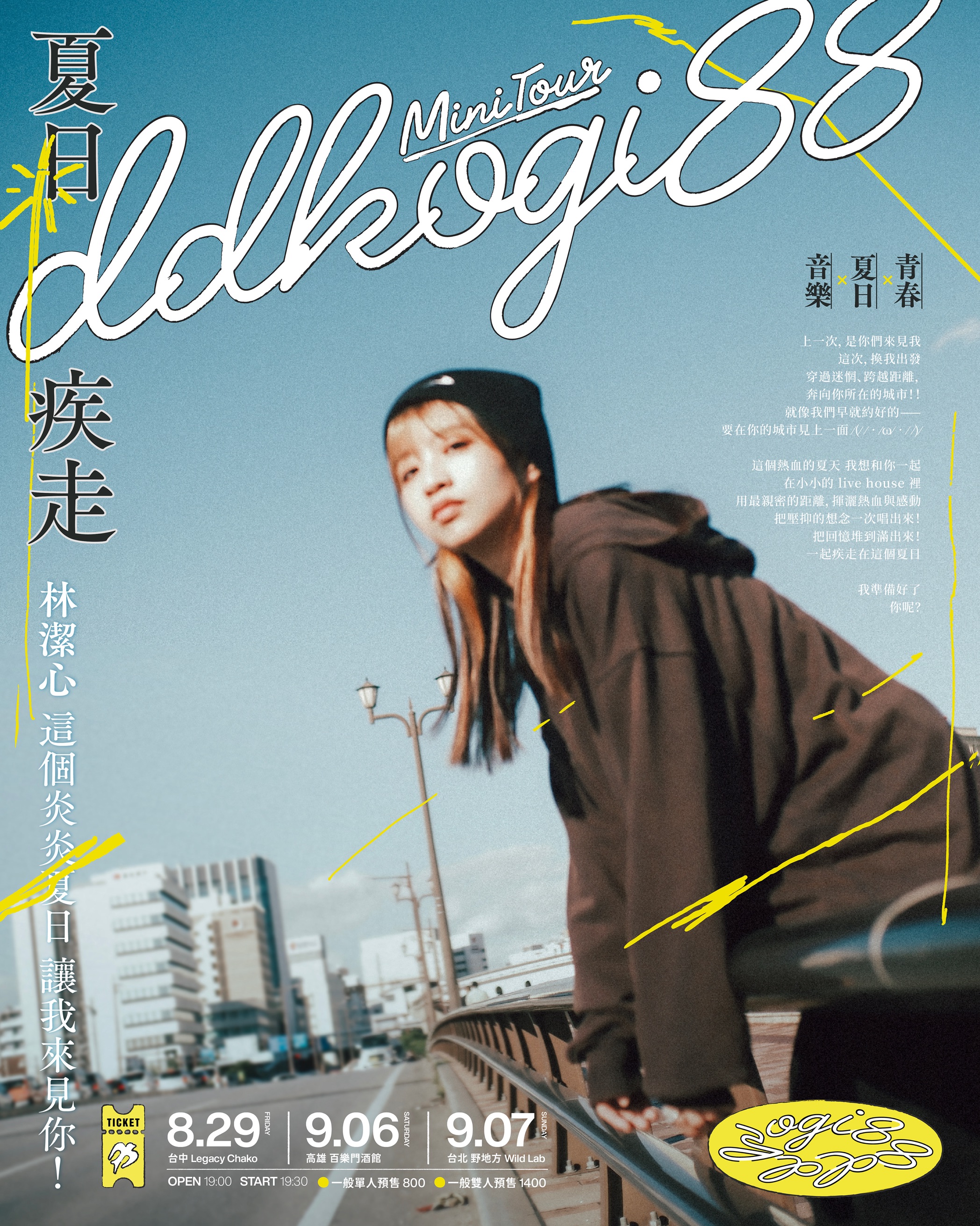 林潔心 夏季小巡迴 Mini Tour《夏日疾走》 🌻 🎫 https://www.indievox.com/tour/search/359 ✹ 啟售時間 :7/25 中午 12:00 正式開賣!✹ 一般單人預售|$800✹ 一般雙人預售|$1400(售票系統為 iNDIEVOX!) 8/29(五)台中|Legacy Chako 9/06(六)高雄|百樂門酒館 9/07(日)台北|野地方 OPEN 19:00|START 19:30
