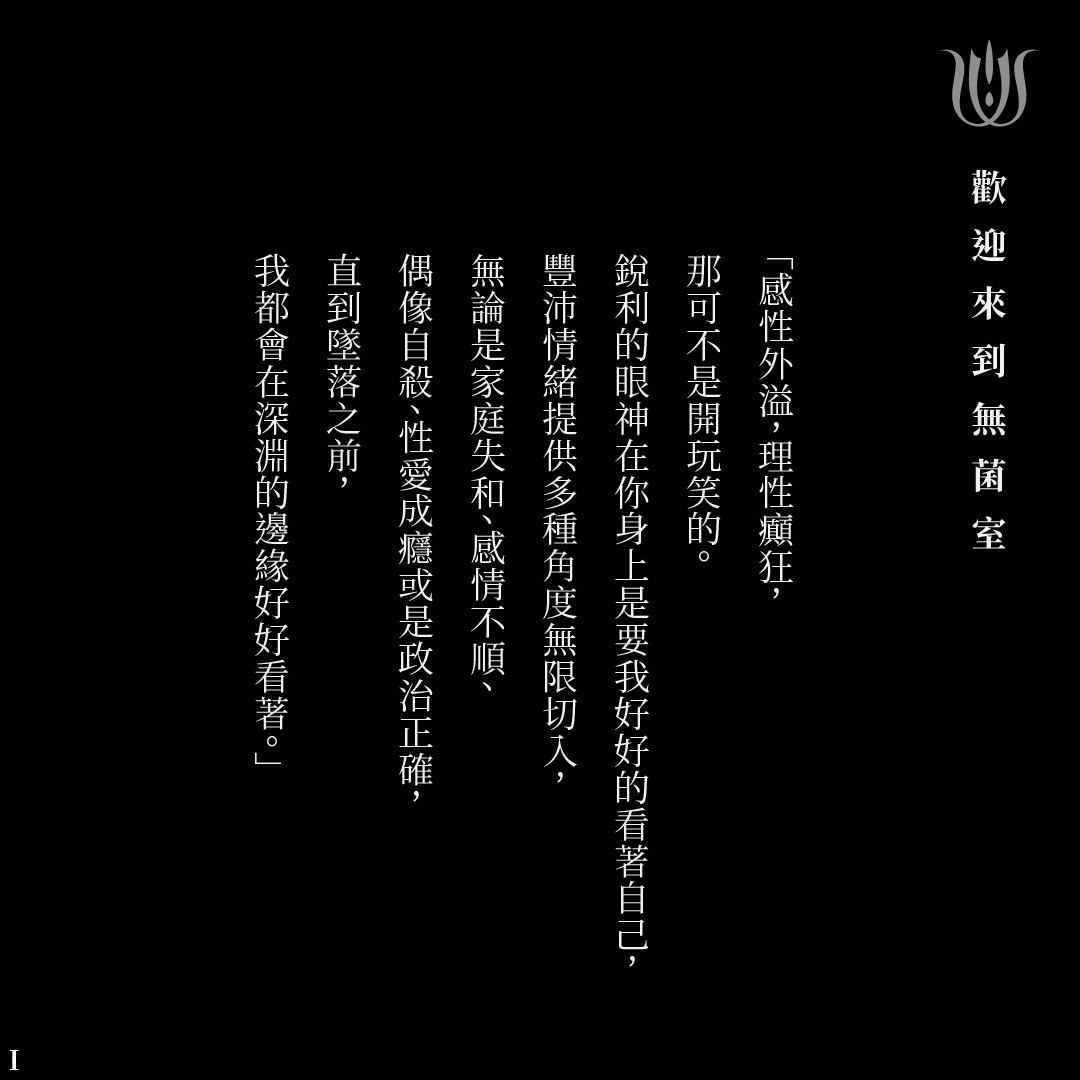 感性外溢,理性癲狂,那可不是開玩笑的。 銳利的眼神在你身上是要我好好的看著自己,豐沛情緒提供多種角度無限切入,無論是家庭失和、感情不順、偶像自殺、性愛成癮或是政治正確,直到墜落之前,我都會在深淵的邊緣好好看著。