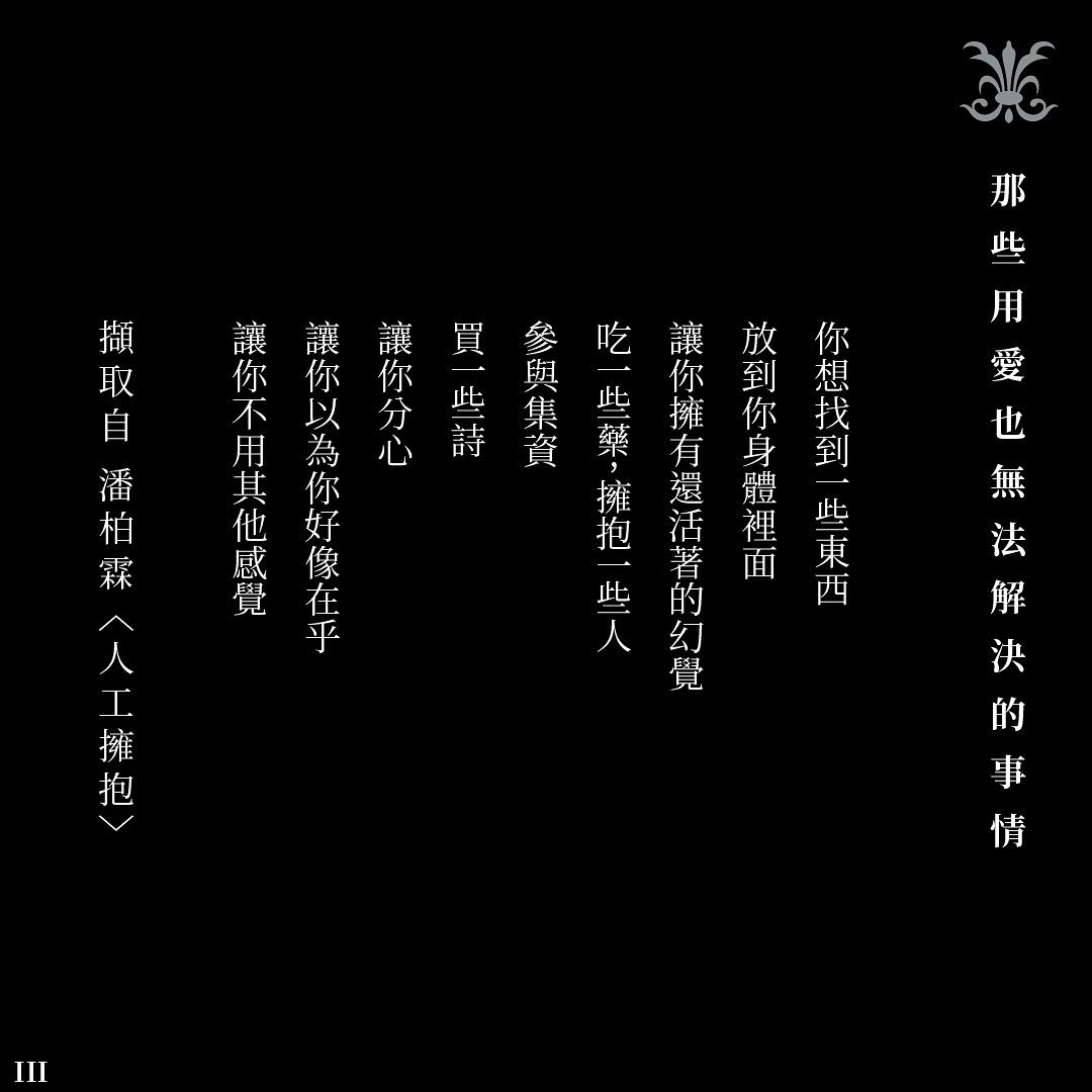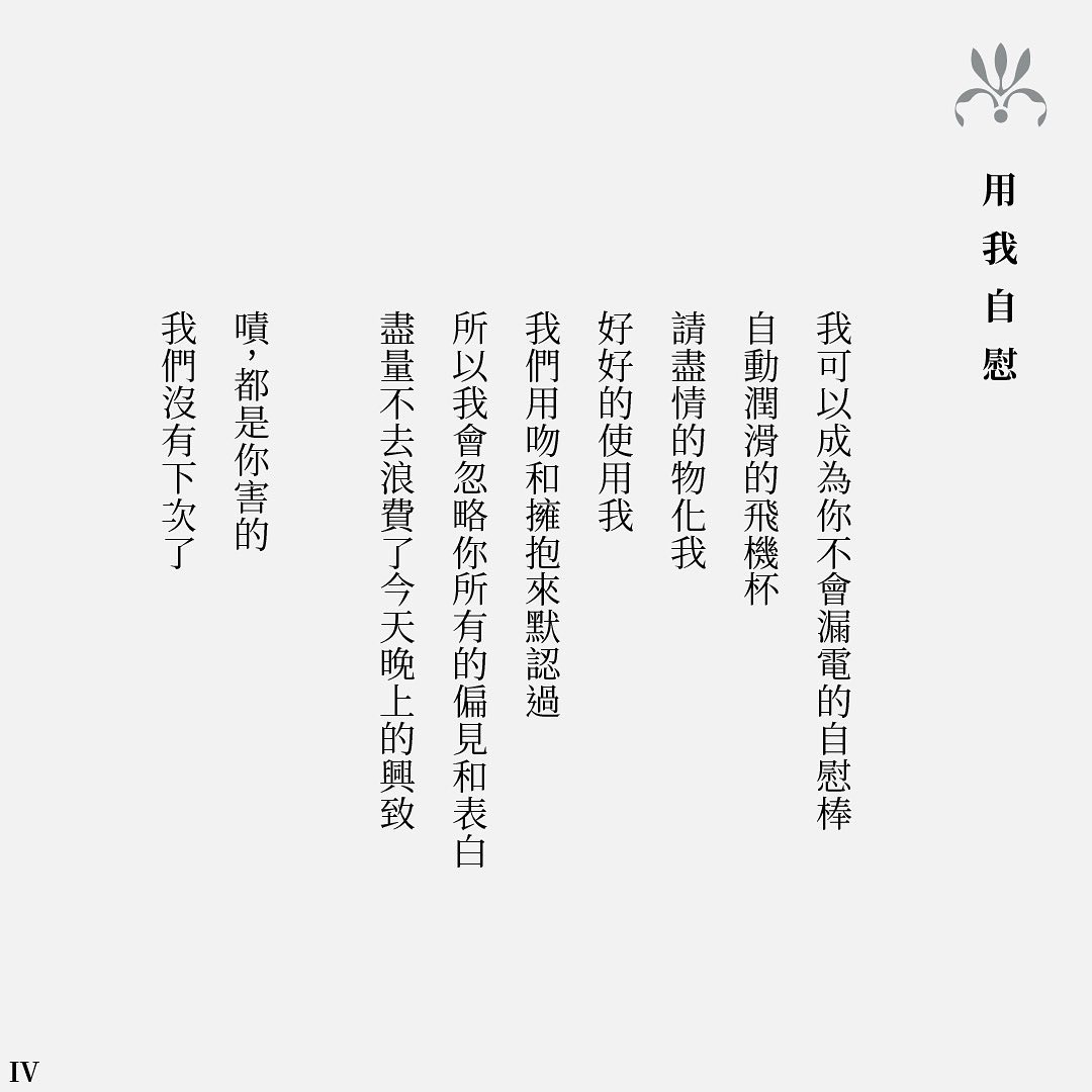 我打算用情撫慰懦弱,用愛抵抗憂鬱,只要一個抱抱就可以;牽我,抱我,吻我,愛我,如果你喜歡的話,可以咬我;許的願望都好奢侈,但我那半吊子的貪婪,眼神居然還能透露出一絲絲溫柔,深怕打擾,卻也無法將就。