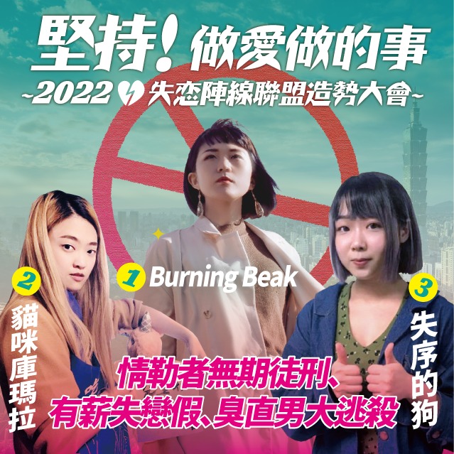 這次我們與好朋友 失戀排行榜、 Anomie Dogs 失序的狗、Burning Beak 組成了「#失戀陣線聯盟」。除了三支樂團演出外,也策劃了Park Park限定「戀愛殘障巴士」及「攤位活動」,如下: