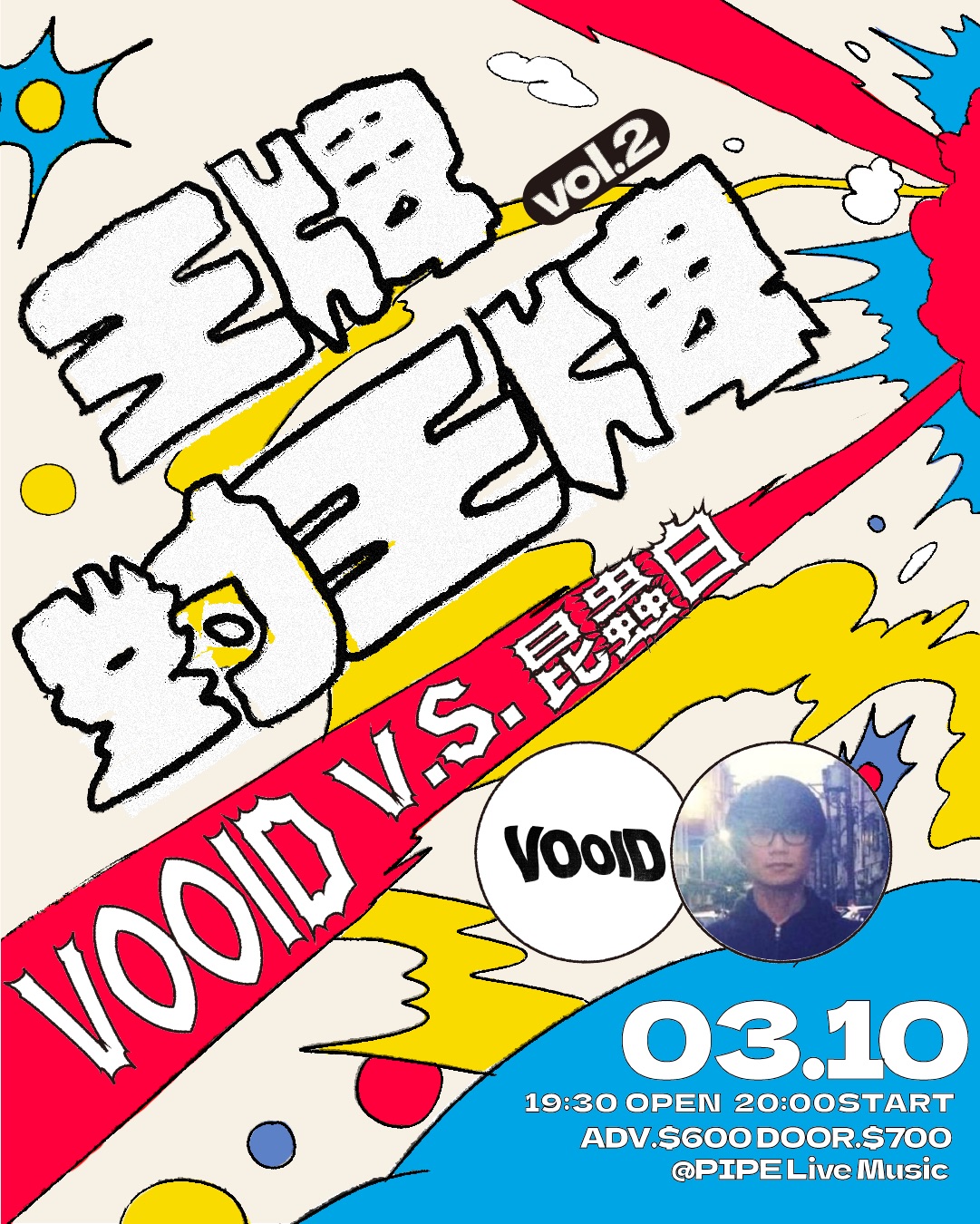三月PIPE最值得期待共演拼盤系列王牌對王牌又要來啦!三月的王牌是昆蟲白,與洪申豪所領軍的 @VOOID 為大家帶來兩個炸翻你耳膜的演出SET,不想後悔給我來就對了!