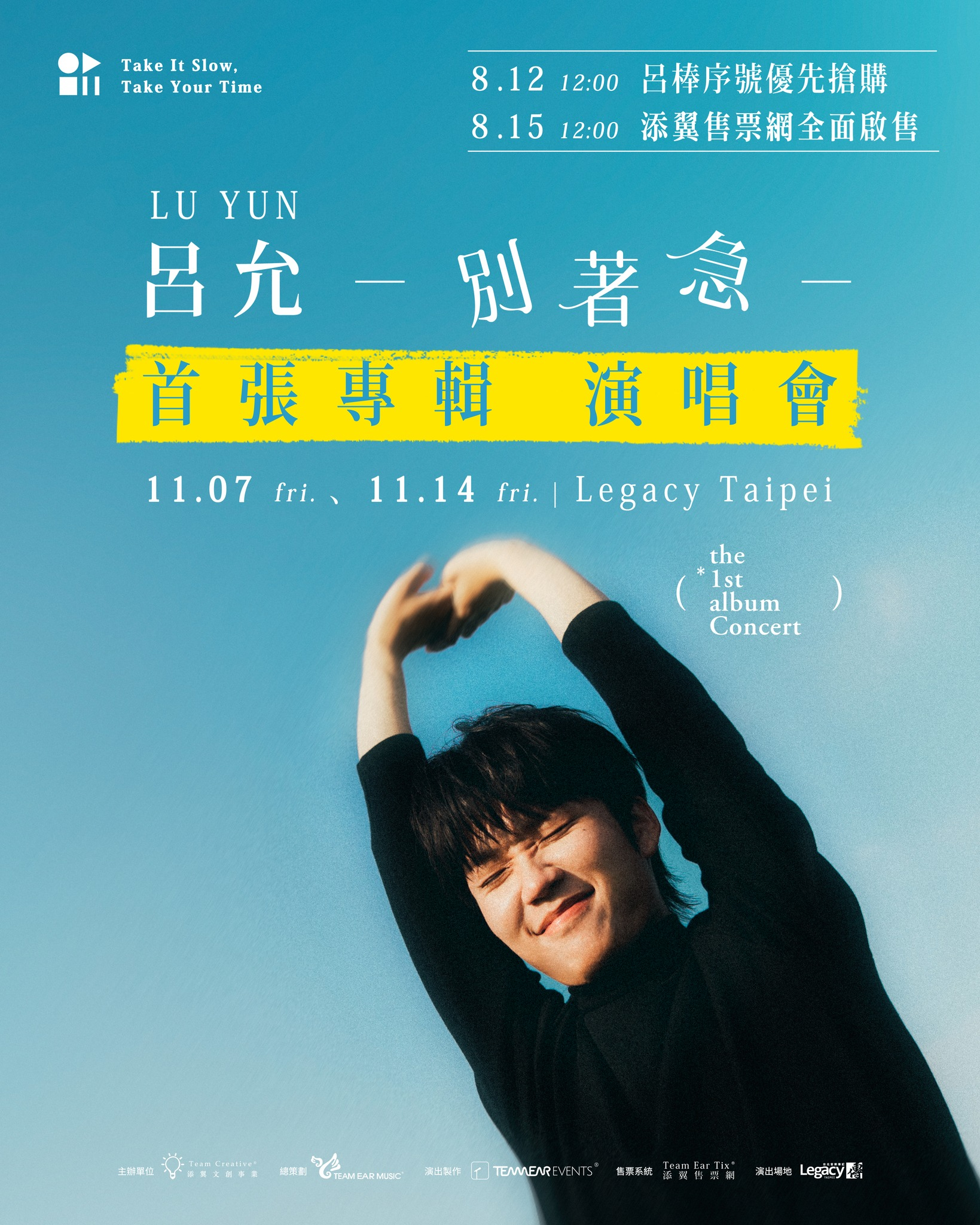 即刻起至 08.10 23:59 前至添翼官網加入會員並完成「呂允 別著急 首張專輯 演唱會」活動,即可取得優先搶購序號。
