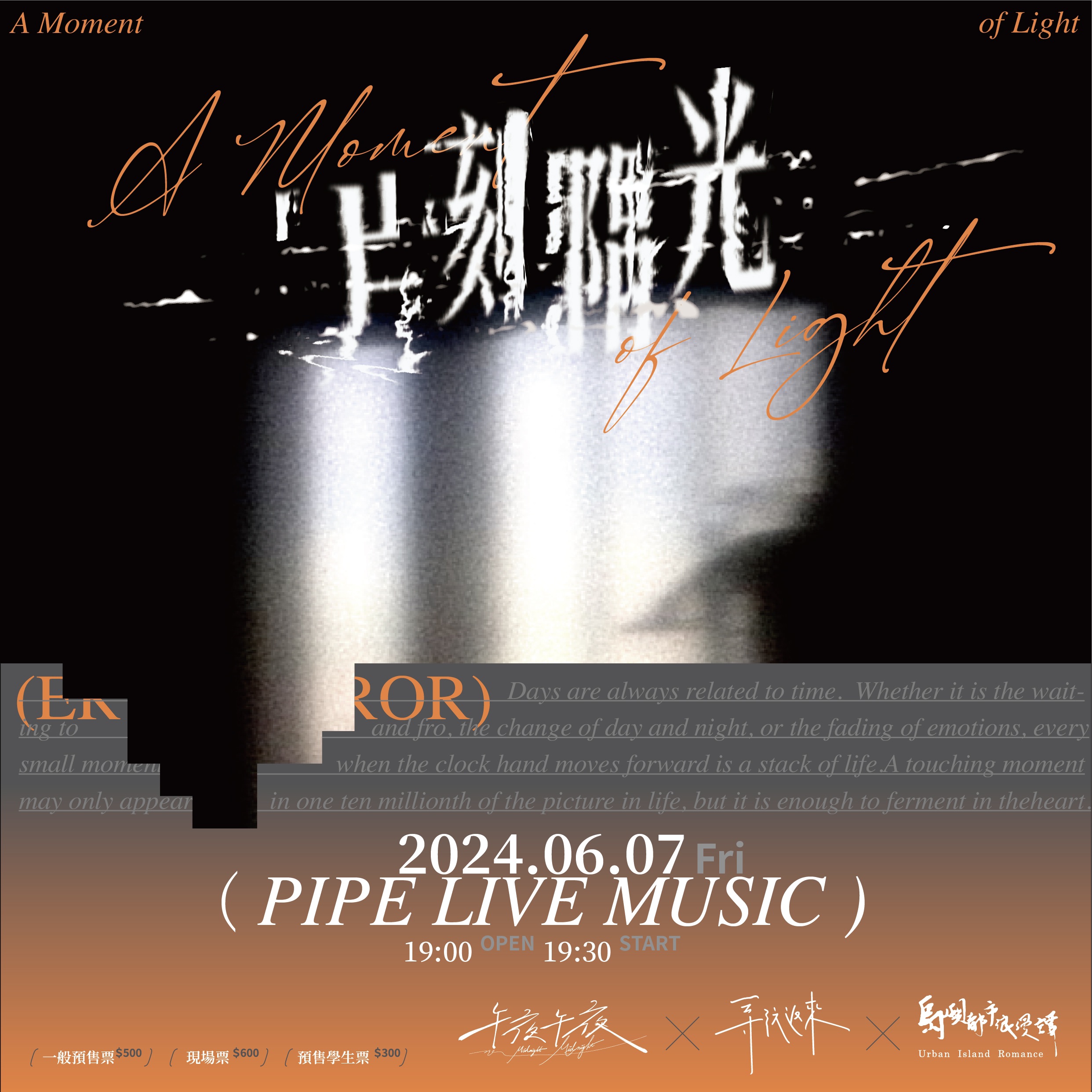 🌅 片刻隅光✸ 日期:2024/06/07 (Fri.)✸ 時間:進場 19:00 / 開演 19:30✸ 地點:PIPE Live Music(公館水岸廣場內)票價:✸ 預售學生票 $300✸ 一般預售票 $500✸ 現場票 $600午夜午夜X 等阮返來X 島嶼都市浪漫譚