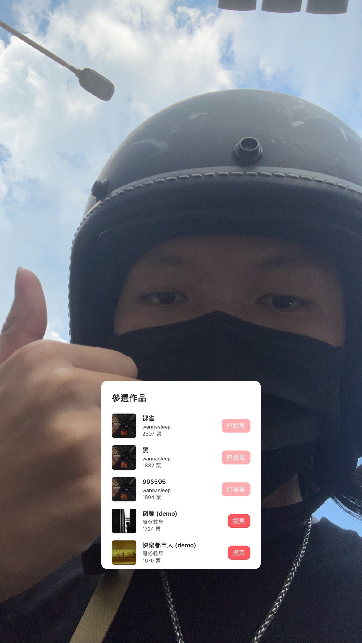 接下來幾天比較忙 最後一次囉嗦催票還有四天 感謝大家了?https://streetvoice.com/opportunities/915/votes/most_votes/