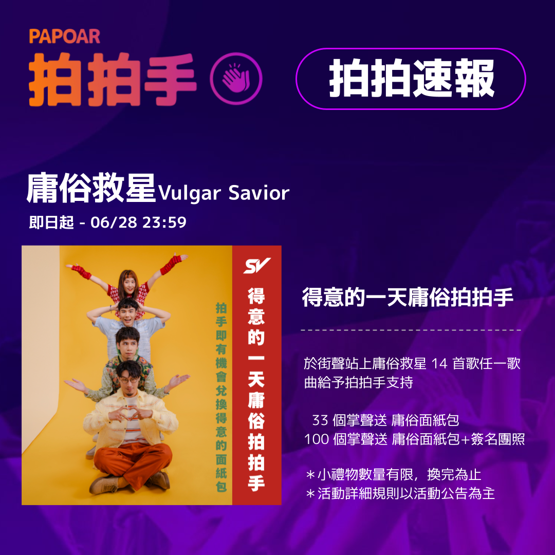 ▸▸▸ 於街聲站上庸俗救星 14 首歌任一歌曲給予拍拍手支持,送庸俗面紙包、簽名團照。