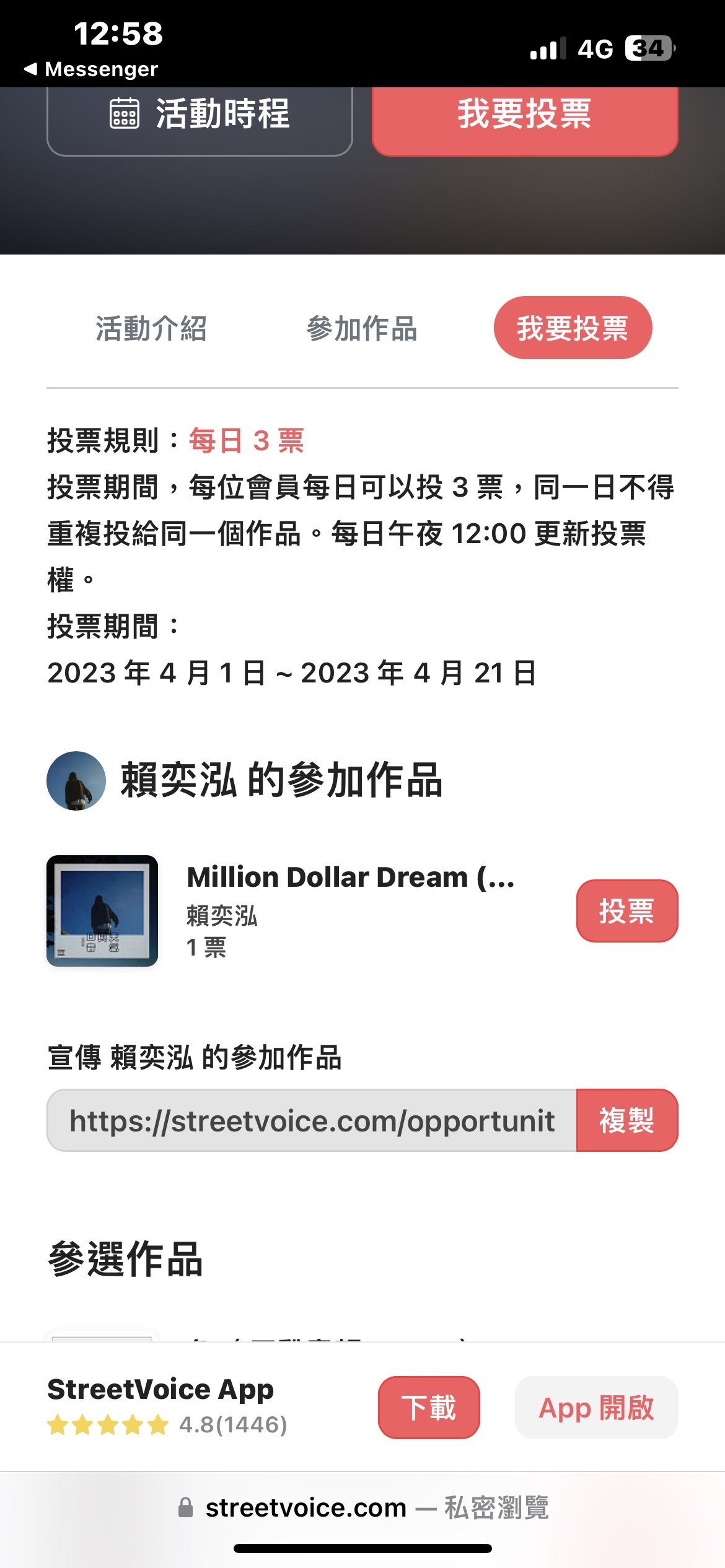 各位街聲的老戰友們!我需要你們!https://streetvoice.com/opportunities/982/votes/most_votes/?target_user=2261769&fbclid=PAAaYh2Y6KRe3zilBinypwaWzAw94X_h7jOwhgoII5dIaaqJnCXoAD1JpE6Fo趕快投一波大的 讓我有更多資源可以做更好的作品!