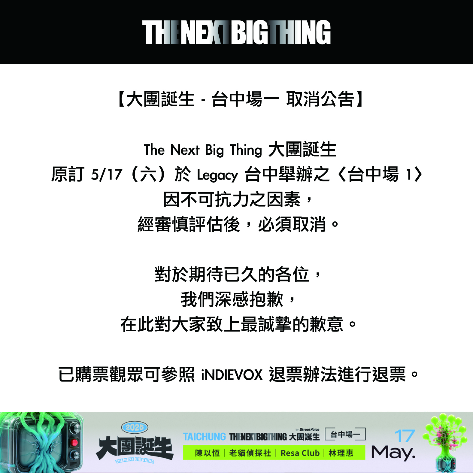 The Next Big Thing 大團誕生原訂 5/17(六)於 Legacy 台中舉辦之〈台中場 1〉因不可抗力之因素,經審慎評估後,必須取消。